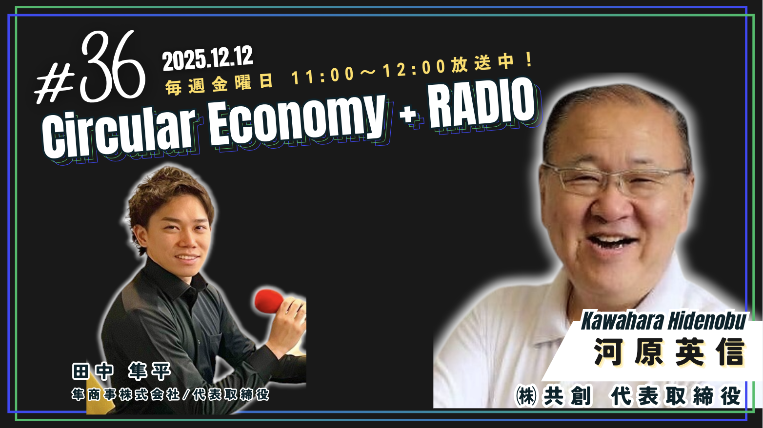 第36回のゲストは㈱共創の河原英信さん。 廃食油回収と地域貢献を合わせた事業を展開しており...